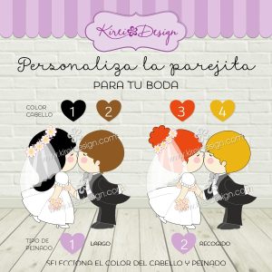 Personaliza la parejita eligiendo color de cabello y peinado de la novia, toma como referencia la imagen donde salen los novios con las opciones disponibles. Se pueden hacer parejitas del mismo sexo, tan sólo debes solicitarlo.