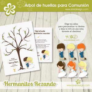 - Árbol de huellas para hermanitos que celebran su primera comunión, en formato PDF para imprimir en tamaño A4 (21 x 29 cm). Incluye además una mini lámina de 21 cm x 14,8 cm con las instrucciones para los invitados.