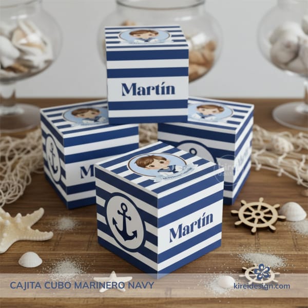 Un detalle práctico y decorativo para completar la mesa dulce de Primera Comunión. Esta cajita cubo de la colección Marinero Navy combina tonos azul y celeste con ilustraciones de anclas, timones, barquitos y un niño vestido de marinero, creando un conjunto armonioso y tierno sin sobrecargar.