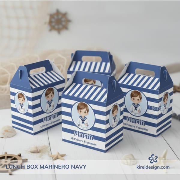Cajita tipo lunch box marinera personalizada con el nombre del niño e ilustración coordinada con la colección Marinero Navy. Una opción original y muy práctica para entregar recuerdos de Primera Comunión con un toque elegante y cuidado.