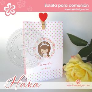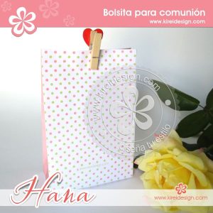 Bolsitas imprimibles para Primera Comunión, corresponden a la linea HANA con un estilo floral en tonos rosas, perfecto para niñas románticas y dulces.
