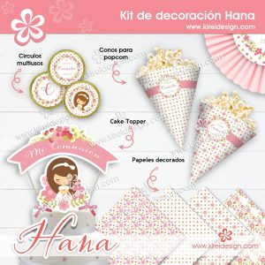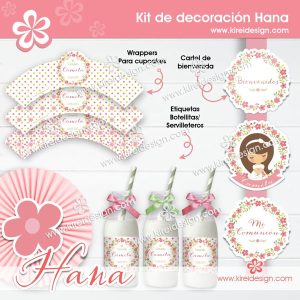 Un kit fresco, floral, muy femenino. Hana es un nombre japonés que significa Flor, por eso denominamos así a esta colección. Imprime cuantas veces lo necesites, recorta, arma y decora tu fiesta para que sea inolvidable.