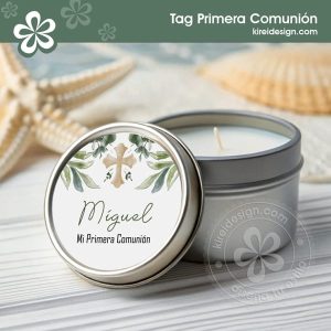 Invitación de Primera Comunión modelo Noa con un niño en traje de marinerito y detalles de follaje verde. Incluye tag circular de 5 cm.