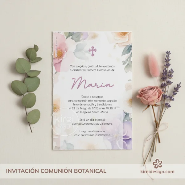 Su estilo armonioso y primaveral la convierte en una opción perfecta para comuniones de niña, ideal para anunciar la celebración a familiares y amigos con un diseño bonito y especial.