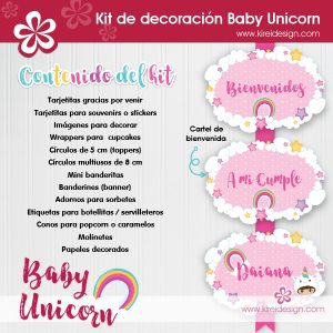 Kit imprimible de decoración Modelo BABY UNICORN, en formato PDF y configurado para imprimir en hojas tamaño A4.