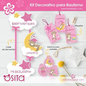 Kit imprimible decorativo para bautismo Modelo Osita, en formato PDF y configurado para imprimir en hojas tamaño A4.