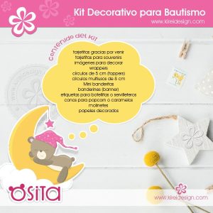 Kit imprimible decorativo con una dulce osita dormilona para bautismo. Puede ser utilizado para diversos eventos como primer añito, baby shower, nacimiento.