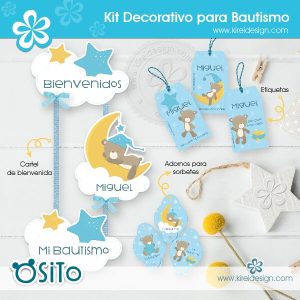 Kit imprimible decorativo para bautismo Modelo Osito, en formato PDF y configurado para imprimir en hojas tamaño A4.