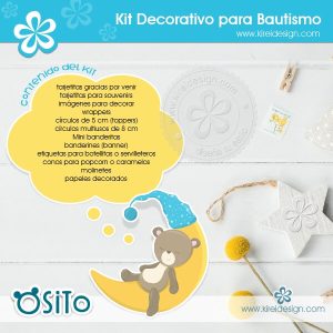Kit imprimible decorativo con un dulce osito dormilón para bautismo. Puede ser utilizado para diversos eventos como primer añito, baby shower, nacimiento.