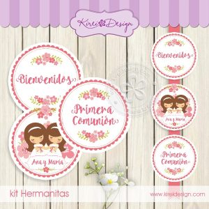 Kit imprimible para Primera Comunión para mellizas, gemelas o amiguitas, en formato PDF y configurado para imprimir en hojas tamaño A4. No es editable, recibes en tu correo el kit con tus datos incluidos y listo para comenzar a imprimir.