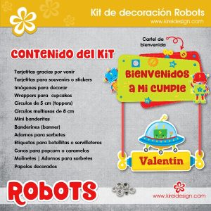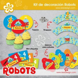 Kit imprimible decorativo Modelo Robots, en formato PDF y configurado para imprimir en hojas tamaño A4.
