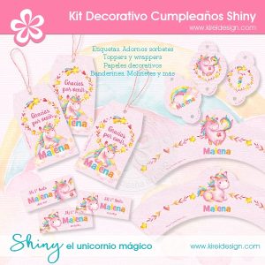 Kit imprimible decorativo para primera cumpleaños, pemite que Shiny, el unicornio mágico transforme tu día en algo muy especial. La invitación y el resto de complementos de este set puedes verlos AQUI