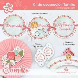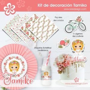 Kit imprimible decorativo para primera comunión, la protagonista es Tamiko, ella espera el día de su comunión rodeada de flores y al lado de su bici. La invitación y el resto de complementos de la colección puedes verlos AQUI