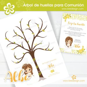 Árbol de huellas para primera comunión, tus invitados pueden dejar de recuerdo su huella como si fuesen hojitas. ? Puedes personalizar a la niña eligiendo su color de cabello y ojitos.