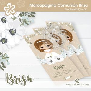 Marcapágina de Primera Comunión para niñas. Brisa está rodeada de flores blancas y espera el día de su comunión para recibir a Jesús en su corazón.