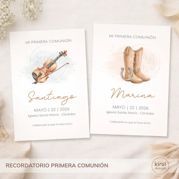 Este recordatorio forma parte de la colección Pequeños Talentos, diseñada para celebrar aquello que hace especial a cada niño en su gran día. A través de ilustraciones suaves en acuarela y una estética cuidada, podrás elegir la actividad que mejor lo represente y crear un recuerdo único, personal y lleno de significado.