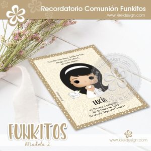 Estampita (recordatorio) de comunión Modelo FUNKITOS para imprimir de 9×13 cm, en formato PDF. El archivo contiene en total 4 tarjetitas y está configurado para imprimir en hoja tamaño A4 cuantas veces quieras.