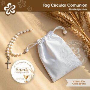 Este recordatorio de Primera Comunión para niño es un detalle lleno de simbolismo y amor. Con una cálida ilustración de un niño orando, acompañada por un cáliz dorado, espigas de trigo y velas encendidas, es perfecta para entregar a los invitados como recuerdo de un día tan especial.