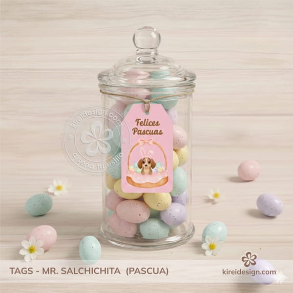 Un set de etiquetas y tarjetas coordinadas con la colección Mr. Salchichita – Edición Pascua, perfectas para personalizar canastas, bolsitas o pequeños regalos.