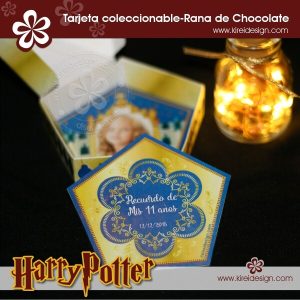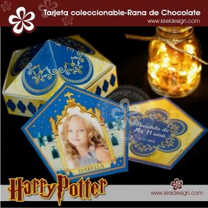 Incluye tu foto y nombre en la tarjeta de magos famosos para coleccionar, es la que viene en la cajita de la rana de chocolate (chocolate frog), pertenece a la colección de Harry Potter.